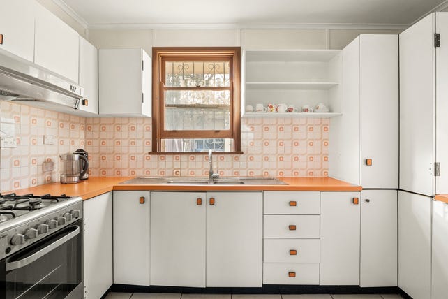 - Retro-style kitchen with white cabinets, orange countertops, and a charming backsplash.